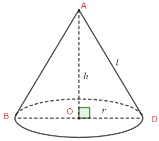 Đường sinh \(l\) của hình nón được tính theo công thức: \({l^2} = {r^2} + {h^2}\)