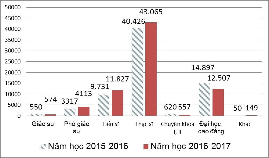 Tính tỉ số phần trăm giữa số giảng viên là tiến sĩ năm học 2016 – 2017 và năm học 2015 – 2016 rồi trừ đi 100%.