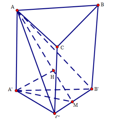 Dựng \(A'H \bot \left( {AB'C'} \right)\). Khi đó \(d\left( {A';\,\,\left( {AB'C'} \right)} \right) = \,A'H\).