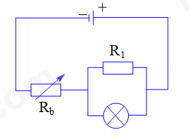 Cho mạch điện gồm điện trở \({R_1} = 4\Omega ,\) đèn ghi 6V–9W, biến trở \({R_b} = 1,5\Omega .\) Nguồn điện có suất điện động 12V, điện trở trong \(2,5\Omega .\) Các dụng cụ trên được mắc như hình vẽ