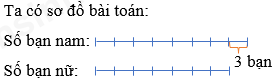 Tính hiệu giữa số nam và số nữ nếu có thêm 9 bạn nam, sau đó vẽ sơ đồ của bài toán rồi dựa vào sơ đồ để tính số bạn nam, số bạn nữ và tổng số bạn.