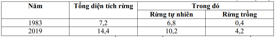 Cho bảng số liệu:DIỆN TÍCH RỪNG NƯỚC TA THỜI KÌ 1983 – 2019(Đơn vị: triệu ha)Theo bảng số