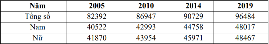 Cho bảng số liệu: DÂN SỐ TRUNG BÌNH PHÂN THEO GIỚI TÍNH CỦA NƯỚC TA GIAI ĐOẠN 2005 - 2019 (Đơn