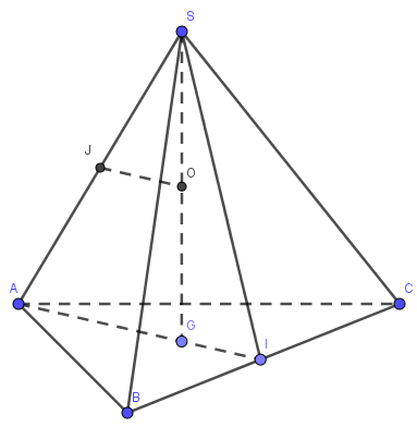 Gọi \(I,J\) lần lượt là trung điểm của \(BC,SA;G\)là tâm của đường tròn ngoại tiếp tam giác \(ABC\)