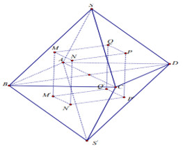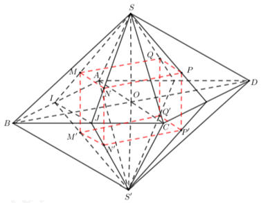 Cho khối bắt diện đều có cạnh \(a\). Gọi \(M,N,P,Q\)lần lượt là trọng tâm của các tam giác \(SAB,SBC,SCD,SDA\); gọi \(M',N',P',Q'\)lần lượt là trọng tâm của các tam giác \(S'AB,S'BC,S'CD,S'DA\)