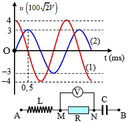 Đặt điện áp xoay chiều vào hai đầu đoạn mạch AB gồm cuộn thuần cảm, điện trở thuần và tụ điện mắc nối tiếp như hình vẽ. Đồ thị biểu diễn sự phụ thuộc vào thời gian hai đầu đoạn mạch AN (đường 1) và điện áp hai đầu đoạn MB (đường 2 ) như hình vẽ. Tìm số chỉ vôn kế lí tưởng