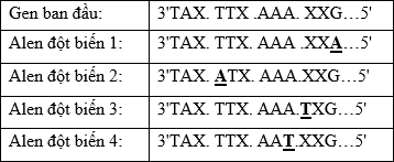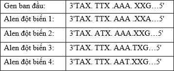 Bảng dưới đây cho biết trật tự nucleotit trên một đoạn ở vùng mã hóa của mạch gốc của gen qui định prôtêin ở sinh vật nhân sơ và các alen được tạo ra từ gen này do đột biến điểm: