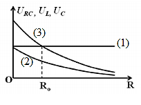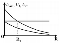 Đặt điện áp xoay chiều có giá trị hiệu dụng và có tần số không đổi vào hai đầu đoạn mạch AB mắc nối tiếp theo thứ tự gồm cuộn cảm thuần có độ tự cảm L, biến trở R và tụ điện có điện dung C. Gọi \({U_{RC}}\) là điện áp hiệu dụng ở hai đầu đoạn mạch gồm tụ điện và biến trở, UC là điện áp hiệu dụng ở hai đầu tụ điện, \({U_L}\) là điện áp hiệu dụng hai đầu cuộn cảm thuần. Hình bên là đồ thị biểu diễn sự phụ thuộc của \({U_{RC}},{U_C},{U_L}\) theo giá trị của biến trở R. Khi \(R = 2{R_0}\) thì hệ số công suất của mạch có giá trị gần bằng