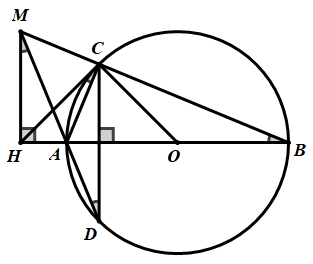 Cho đường tròn \(\left( {O;2cm} \right)\) đường kính \(AB\). Lấy điểm \(C\) trên đường tròn sao cho \(\angle AOC = {45^0}\). Đường thẳng qua \(C\) và vuông góc với \(AB\) cắt \(\left( O \right)\) tại \(D\). Kéo dài \(BC\) và \(DA\) cắt nhau tại \(M\). Kẻ \(MH \bot AB\) tại \(H\).