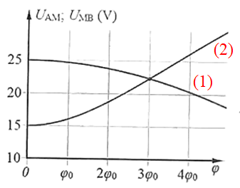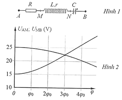 Đặt điện áp xoay chiều \(u = {U_0}\cos \left( {\omega t} \right)\) vào hai đầu đoạn mạch AB như hình 1, trong đó tụ điện có điện dung C thay đổi được. Hình 2 là đường biểu diễn mối liên hệ giữa điện áp hiệu dụng \({U_{AM}}\) với \(\varphi \) và đường biểu diễn mối liên hệ giữa điện áp hiệu dụng \({U_{MB}}\) với \(\varphi \) (\(\varphi \) là độ lệch pha giữa điện áp u với cường độ dòng điện). Điều chỉnh C để \(\varphi = 6{\varphi _0}\), khi đó \({U_{AM}}\) bằng