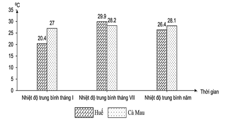 Cho biểu đồ:NHIỆT ĐỘ TRUNG BÌNH THÁNG 1, THÁNG VII VÀ TRUNG BÌNH NĂMCỦA HUẾ, CÀ MAU NĂM