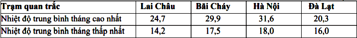 NHIỆT ĐỘ TRUNG BÌNH THÁNG CAO NHẤT VÀ THẤP NHẤT