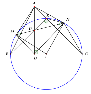 Cho \(\Delta ABC\) nhọn có đường cao \(AD\) và \(H\) là trực tâm tam giác. Vẽ đường tròn tâm \(I\) đường kính \(BC,\) từ \(A\) kẻ các tiếp tuyến \(AM,\,\,AN\) với đường tròn \(\left( I \right)\) (\(M,\,\,N\) là các tiếp điểm).