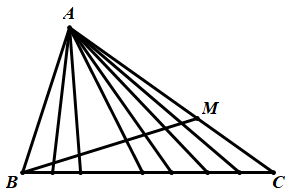 Cho tam giác \(ABC\), trong tam giác từ \(A\) chia thành \(7\) tam giác nhỏ, từ \(B\) kẻ đường thẳng