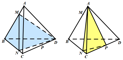 Cho tứ diện \(ABCD\), lấy điểm \(M\) trên cạnh \(AB\), điểm \(N\) trên cạnh \(AC\), điểm \(P\)