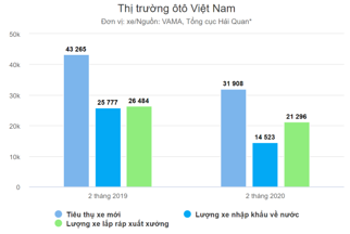 Cho biểu đồ hình cột thể hiện số lượng xe xuất, nhập khẩu, tiêu thụ của Thị trường ôtô Việt Nam trong hai tháng đầu năm 2020 (Không tính số liệu của TC Motor).