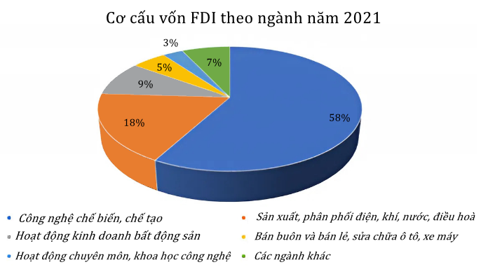 Cơ cấu vốn đầu tư nước ngoài (FDI) vào Việt Nam theo ngành trong năm 2021 được thể hiện thông qua biểu đồ sau: