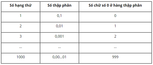 a) Số hạng thứ \(1000\) có bao nhiêu chữ số \(0\) ở phần thập phân?