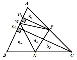 Đặt \(S = {S_{ABC}},{S_1} = {S_{AMP}},{S_2} = {S_{BMN}},{S_3} = {S_{CNP}}\) và \({S_4} = {S_{MNP}}\)