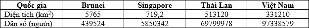 Cho bảng số liệu: DIỆN TÍCH VÀ DÂN SỐ CỦA MỘT SỐ NƯỚC ĐÔNG NAM Á NĂM 2020 (Nguồn: