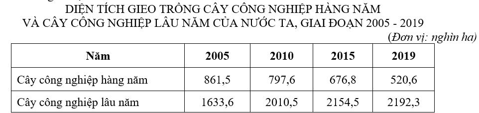 Theo bảng số liệu, để thể hiện sự chuyển dịch cơ cấu diện tích gieo trồng cây công nghiệp của nước ta trong giai đoạn 2005 - 2019, dạng biểu đồ nào sau đây là thích hợp nhất?