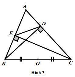 Cho tam giác nhọn \(ABC\), có các đường cao \(BD,CE;O\) là trung điểm của \(BC\) (Hình 3). Khẳng