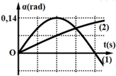 Một sợi dây nhẹ không dãn có chiều dài 1,5m được cắt thành hai phần làm thành hai con lắc đơn có chiều dài khác nhau. Kích thích cho hai con lắc dao động điều hòa cùng biên độ góc tại nơi có gia tốc trọng trường \(g = 9,8\left( {m/{s^2}} \right)\). Hình vẽ bên là đồ thị phụ thuộc thời gian của các li độ góc của các con lắc. Tốc độ dao động cực đại của vật nặng của con lắc (2) gần giá trị nào nhất sau đây?