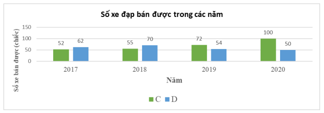 Biểu đồ cột kép sau đây biểu diễn số xe đạp bán được của mẫu xe C và xe D trong các năm từ 2017 đến năm 2020. Dựa vào biểu đồ, em hãy Chọn đáp án đúng cho câu hỏi sau.