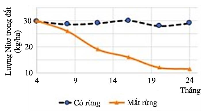 a) So sánh lượng nitơ trong đất giữa nơi có rừng và nơi mất rừng theo thời gian.