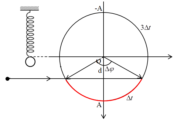 b) Một thiết bị báo động có một đèn phát ra tia sáng nằm ngang và một đầu thu tia sáng. Đặt thiết bị sao cho vị trí cân bằng của vật nặng cách tia sáng một khoảng d. Vật nặng làm bằng vật liệu chắn sáng. Thiết bị sẽ báo động khi tia sáng bị vật nặng chắn. Bỏ qua khoảng thời gian chắn tia sáng của vật nặng (vật nặng có kích thước đủ nhỏ). Biết thiết bị báo động sau những khoảng thời gian liên tiếp là \(\Delta t,\,\,3\Delta t,\,\,\Delta t,\,\,3\Delta t,...\) Tìm biểu thức của d và \(\Delta t\) theo \(\Delta l,\,\,k\) và m.