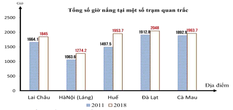 Theo biểu đồ, nhận xét nào sau đây đúng về tổng số giờ nắng tại một số trạm quan trắc của Việt Nam?