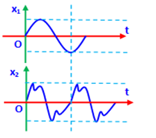 Đồ thị dao động âm do hai dụng cụ phát ra biểu diễn như hình vẽ bên. Ta có kết luận đúng
