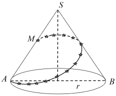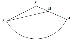Nhân dịp năm mới để trang trí một cây thông Noel, ở sân trung tâm có hình nón \(\left( N \right)\) như hình vẽ sau. Người ta cuộn quanh cây bằng một sợi dây đèn LED nhấp nháy, bóng đèn hình hoa tuyết từ điểm \(A\) đến điểm \(M\) sao cho sợi dây luôn tựa trên mặt nón. Biết rằng bán kính đáy hình nón bằng \(8m\), độ dài đường sinh bằng \(24m\) và \(M\) là điểm sao cho \(2\overrightarrow {MS} + \overrightarrow {MA} = \overrightarrow 0 \). Hãy tính chiều dài nhỏ nhất của sợi dây đèn cần có