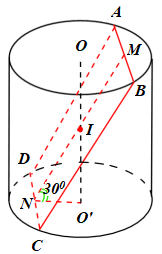 Cho hình trụ \(\left( T \right)\) có bán kính đáy bằng \(a\). Một hình vuông \(ABCD\) có hai cạnh \(AB,\,\,CD\) lần lượt là hai dây cung của hai đường tròn đáy. Hai cạnh \(AD,\,\,BC\) không phải là đường sinh của hình trụ \(\left( T \right)\). Biết mặt phẳng \(\left( {ABCD} \right)\) tạo với mặt đáy góc bằng \({30^0}\). Tính độ dài cạnh hình vuông.