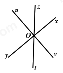 Gọi \(O\) là giao điểm của ba đường thẳng \(xy,zt,uv\). Kẻ tên các góc bẹt đỉnh \(O\).