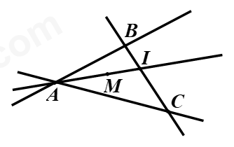 b) Gọi \(I\) là giao điểm của hai đường thẳng \(AM\) và \(BC\). Hỏi điểm \(I\) nằm trong góc nào trong số các góc sau: \(\angle BAC,\angle BMC.\)