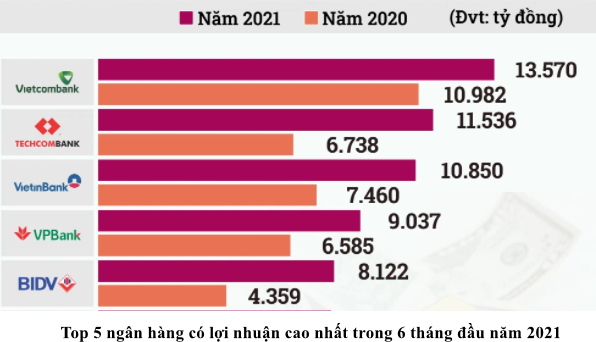 Tổng lợi nhuận của 5 ngân hàng này trong 6 tháng đầu năm 2021 là bao nhiêu?