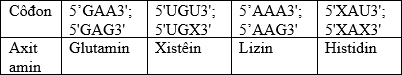 Cho biết các côđon mã hóa một số loại axit amin như sau: