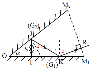Hai gương phẳng hình chữ nhật giống nhau được ghép chung theo một cạnh tạo thành góc \(\alpha \) như hình vẽ \(\left( {O{M_1} = O{M_2}} \right)\). Trong khoảng giữa hai gương, gần O, có một điểm sáng S. Biết rằng tia sáng từ S đập vuông góc vào \({G_1}\) sau khi phản xạ ở \({G_1}\) thì đập vào \({G_2}\), sau khi phản xạ ở \({G_2}\) lại đập vào \({G_1}\) và phản xạ trên \({G_1}\) một lần nữa. Tia phản xạ cuối cùng vuông góc với \({M_1}{M_2}\). Tính \(\alpha \).
