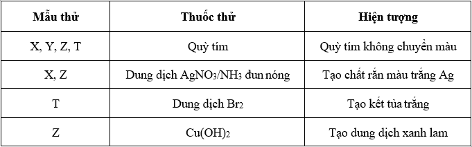Tiến hành thí nghiệm với các dung dịch X, Y, Z, T thu được kết quả như sau: