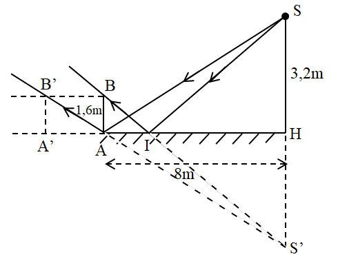 Một hồ nước yên tĩnh có bề rộng 8m. Trên bờ hồ có một cột điện cao 3,2m có treo một bóng đèn ở đỉnh. Một người đứng ở bờ đối diện quan sát ảnh của bóng đèn, mắt người này cách mặt đất 1,6m.