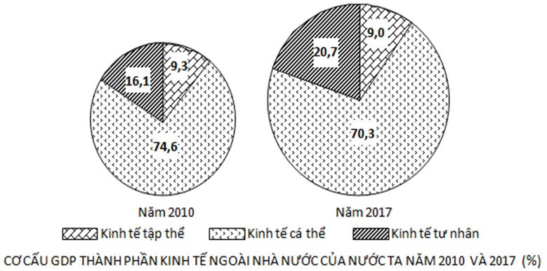 Theo biểu đồ, nhận xét nào sau đây đúng về sự thay đổi tỉ trọng trong cơ cấu GDP thành phần kinh tế ngoài Nhà nước của nước ta năm 2017 so với năm 2010?