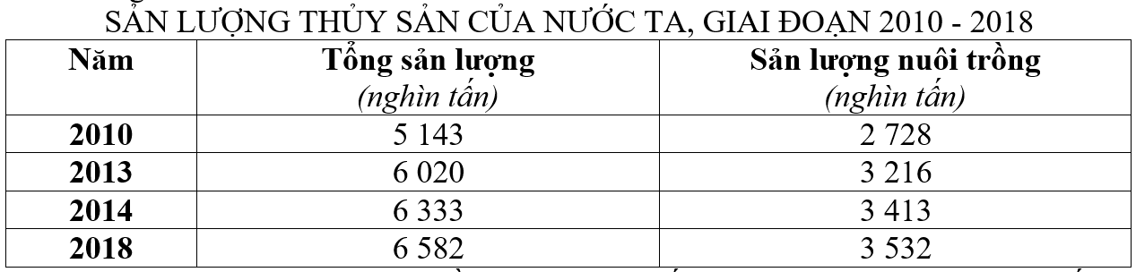 Theo bảng số liệu, để thể hiện sự chuyển dịch cơ cấu sản lượng thủy sản phân theo nuôi trồng và đánh bắt của nước ta giai đoạn 2010 - 2018, dạng biểu đồ nào sau đây là thích hợp nhất?
