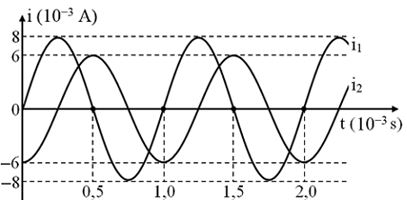 Hai mạch dao động điện từ LC lí tưởng đang có dao động điện từ tự do với các cường độ dòng điện tức thời trong hai mạch là \({i_1}\) và \({i_2}\) được biểu diễn như hình vẽ. Tổng điện tích của hai tụ điện trong hai mạch ở cùng một thời điểm có giá trị lớn nhất bằng