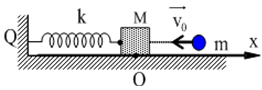 Cho cơ hệ như hình vẽ, lò xo lý tưởng có độ cứng \(k = 100N/m\) được gắn chặt ở tường tại Q, vật \(M = 200g\) được gắn với lò xo bằng một mối hàn, vật M đang ở vị trí cân bằng thì vật \(m = 50g\) bay tới với vận tốc \({v_0} = 2\;m/s\) va chạm mềm với vật M. Sau va chạm hai vật dính liền với nhau và dao động điều hòa. Bỏ qua ma sát giữa các vật với mặt phẳng ngang. Sau một thời gian dao động, mối hàn gắn giữa M và lò xo bị lỏng dần, ở thời điểm t hệ vật đang ở vị trí lực nén nên lò xo vào Q cực đại. Biết rằng, kể từ thời điểm t mối hàn có thể chịu được một lực nén tùy ý nhưng chỉ chịu được một lực kéo tối đa là 1N. Sau khoảng thời gian ngắn nhất là bao nhiêu (tính từ thời điểm t) mối hàn sẽ bị bật ra: