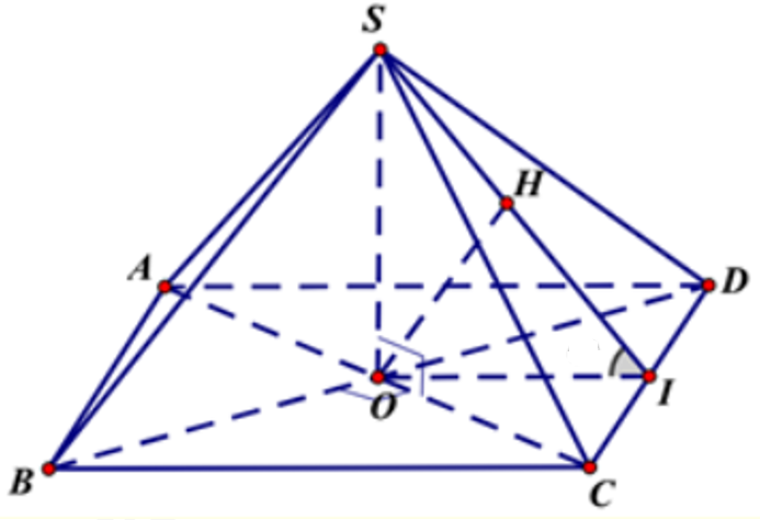 Cho hình chóp tứ giác đều \(S.ABCD\) có cạnh đáy bằng \(2a\), cạnh bên bằng \(a\sqrt 3 \). Tính góc giữa mặt phẳng \(\left( {ABCD} \right)\) và \(\left( {SCD} \right)\)