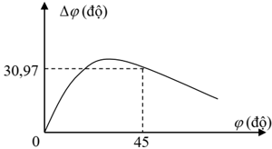 Đặt điện áp xoay chiều \({u_{AB}} = U\sqrt 2 \cos \left( {\omega t} \right)\left( V \right)\) (\(U,\omega \) không đổi) vào hai đầu đoạn mạch gồm đoạn AM mắc nối tiếp đoạn MB . Đoạn AM chứa điện trở thuần R, đoạn MB chứa cuộn dây không thuần cảm và tụ điện mắc nối tiếp. Cho biết điện trở R, độ tự cảm của cuộn dây L, điện trở cuộn dây r không đổi, điện dung C của tụ điện thay đổi được. Gọi độ lớn của độ lệch pha giữa điện áp \({u_{MB}}\) và \({u_{AB}}\) là \(\Delta \varphi \); độ lớn của độ lệch pha giữa điện áp uAB và cường độ dòng điện là \(\varphi \). Hình bên là đồ thị biểu diễn sự phụ thuộc của \(\Delta \varphi \) vào \(\varphi \). Khi \(\Delta \varphi \) đạt giá trị cực đại thì tỉ số điện áp hiệu dụng \(\dfrac{U}{{{U_{AM}}}}\) có giá trị là