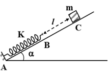 Trên mặt phẳng nghiêng góc \(\alpha = {30^0}\) so với mặt phẳng ngang có vật nhỏ khối lượng \(m = 1kg\), lò xo nhẹ có độ cứng \(k = 100N/m\). Bỏ qua mọi ma sát, lấy \(g = 10{\rm{ }}m/{s^2}\). Ban đầu giữ vật ở điểm C; lò xo có chiều dài tự nhiên, đầu A của lò xo được gắn cố định, đầu B cách C một khoảng \(l = 2,5cm\) (như hình vẽ bên). Buông nhẹ để vật trượt xuống không vận tốc ban đầu, vật dính chặt vào đầu B của lò xo tạo thành con lắc lò xo và dao động điều hòa. Chọn trục tọa độ trùng với trục lò xo, chiều dương hướng xuống dưới, gốc tọa độ tại vị trí cân bằng của vật, gốc thời gian là lúc vật bắt đầu dao động. Tốc độ trung bình của vật kể từ lúc vật bắt đầu dao động đến thời điểm lò xo bị biến dạng cực đại lần đầu tiên là
