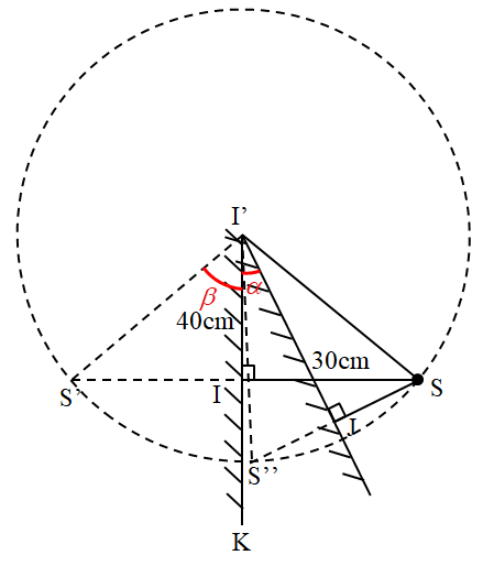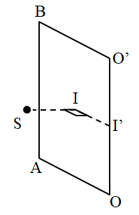 Một gương phẳng OABO’ hình chữ nhật có bề rộng OA = 0,80m được gắn vào một cửa tủ. Gương có thể quay quanh bản lề OO’ thẳng đứng nằm ở mép gương. Trên đường vuông góc với mặt gương tại tâm I và cách gương một đoạn 0,30m có một ngọn nến S. Mở cửa tủ để gương quay một góc \({30^0}\) quanh bản lề OO’. Xác định quỹ đạo chuyển động của ảnh khi gương quay và tính chiều dài quỹ đạo.