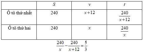 Hai ôtô khởi hành cùng một lúc đi từ A đến B dài 240km. Vì mỗi giờ ôtô thứ nhất đi nhanh hơn ôtô thứ hai 12km nên nó đến trước ô tô thứ hai 1 giờ 40 phút. Tính vận tốc của mỗi ôtô.